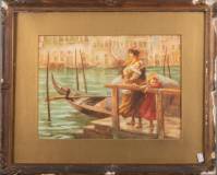 Italiaanse School: moeder met kinderen op een kade in Venetië, aquarel, gesigneerd Ferini, 22,5 x 31,5 cm