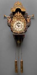 Polychroom beschilderd stoelklokje, het front met voorstelling van de Waag en de Baangracht te Alkmaar, de wijzerplaat met Romeinse cijferring en bekroond door stadswapen van Alkmaar, 20e eeuw -houten achterplaat en deurtjes van latere datum-, 48 x 36 x 14 cm