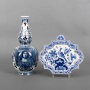 Delfts aardewerk knobbelvaas met blauw-wit portretdecor naar Rembrandt -haarlijn-, en Delfts aardewerk wandhanger met blauw-wit vogel- en bloemdecor, beide uitvoering De Porceleyne Fles, 20e eeuw, 39 x Ø 18 en 26 x 29 cm
