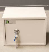 Grijsgelakte stalen brandkast met sleutel, uitvoering De Raat, 25 x 35 x 25 cm