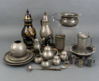 Divers tin, waaronder: kraantjeskannen, borden, maatbekers, klepkan, en een morellenlepel