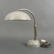 Grijsgelakte stalen bureaulamp aan verstelbare arm op verhoogd ijzeren basement, variatie op model 144, ontwerp Herman Busquet, uitvoering Hala, Zeist, circa 1950, 47 cm