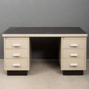 Bureau met zwart kunststof blad waaromheen metalen rand, waaronder twee metalen ladenblokken, uitvoering Asmeta -corrosie en blad met gebruikssporen-, 77 x 150 x 76 cm