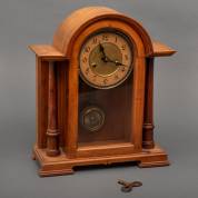 Tafelklok in notenhouten kast met messing wijzerplaat, verso gedateerd nov. 1949, 39 x 33,5 x 14 cm