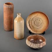 Hoge bruingeglazuurde keramiek vaas met verticaal lijnendecor, onduidelijk gemerkt, handgevormde deels bruin-beigegeglazuurde raku kom, gemonogrammeerd B, bruin-beigegeglazuurde keramiek fles en bord, beide niet gemerkt
