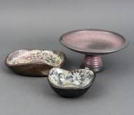Twee zwarte keramiek schalen, de geglazuurde binnenzijden met bloem- en spatdecor, beide gesigneerd Ariane, La Po(è)terie, daarbij: zwart-paarse keramiek tazza, onduidelijk gesigneerd, 14 x Ø 29 cm