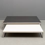 Paar lage in elkaar passende salontafels op chromen onderstel, de één met een zwart blad, de ander wit, model Solo, ontwerp Antonio Citterio, uitvoering B&B Italia, laatste kwart 20e eeuw, 22 x 89 x 101 cm