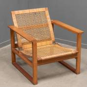 Eiken armstoel met beweegbare rug, de zitting en rug met rietbespanning, model BM-2254/56 Easy Chairs, ontwerp Børge Mogensen, uitvoering Fredericia Stolefabrik, Denemarken, circa 1950 -enkele defecten bespanning-, 66 x 66 x 74 cm