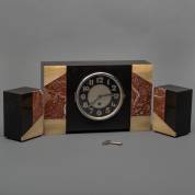 Driedelig pendulestel in zwart, rood en geel marmer, art deco-stijl -inclusief sleutel, lichte gebruikssporen-, 23 x 36 x 9,5 cm