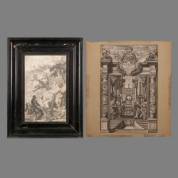 Georg Heinrich Schifflin (1666-1745), 'Elisabetha post funera vivens', gravure -gelijmd op achterblad-, en Bernard Picart (1673-1733), Geschiedenis leunt met haar boek op een globe en schrijft de wereldgeschiedenis, gravure -vochtplekken-, 36 x 22,5 en 30 x 19,5 cm