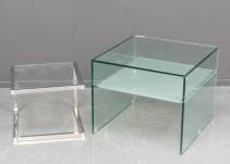 Vierkante glazen bijzettafel met gesatineerd glazen etagère, en verchroomd stalen met glazen blad, 50 x 60 x 60 cm