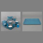 Diverse donkerblauwgeëmailleerde keukengerei met gouden bies -defecten en corrosie-