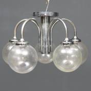 Vijflichts plafondlamp met glazen bollen op verchroomd stalen armatuur, uitvoering Solken Leuchten, Duitsland, circa 1980 -één bol met barstje-, 32 x Ø 49 cm