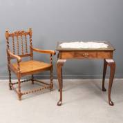 Mahonie theetafel met één lade en afgedekt met glazen beschermblad, Engeland, circa 1900, en eiken armstoel met rieten zitting en getorste regels, Hollands, 19e eeuw, 76 x 75 x 54 cm