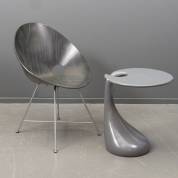 Grijsgelakte gebogen houten kuipstoel op stalen buisframe onderstel, model S664, ontwerp Eddie Harlis, uitvoering Thonet -lak verweerd-, daarbij grijsgelakt kunststof bijzettafeltje, 85 x 56 x 60 cm