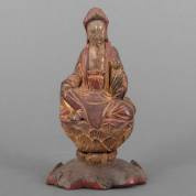 Deels vergulde rood lakwerk houten beeldje: Guanyin, China, op los basement -defecten-, 24 x 14 x 10 cm