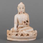 Albasten sculptuur: Boeddha, zittend in maravijaya, de handen in bhumisparsha mudra, Birma, modern -rechterpunt met chip-, 22 x 18 x 8 cm
