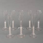 Acht slanke slingerglazen met taps toelopende kelken en fijne witte draadslingers in de stam, circa 1800 -één glas met chip van voet, één glas met schilfer van voet-, 19 cm