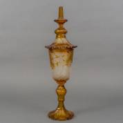 Amberkleurige kristallen überfang dekselbokaal met geëtst decor van herten, 19e eeuw -deksel met randschilfer-, 49,5 cm