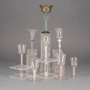 Zeven diverse slingerglazen, 18e eeuw -drie glazen met chipje van voet-, daarbij: gekleurd glas met gedraaide stam, 20e eeuw
