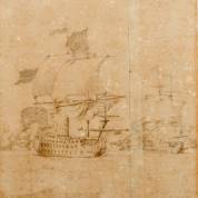 Willem van de Velde de Oude (1611-1693), afvarend Engels eskader vooraf gegaan door een 'first rate', grafietstift en penseel op twee samengevoegde vellen papier, niet gesigneerd, circa 1680, verso opschrift: 'coll Adm. S. Ed Codrington', inclusief authenticiteitsonderzoek verricht door Dr. Remmelt Daalder, 23,5 x 17,5 cm