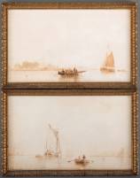 Everhardus Koster (1817-1892), twee waterlandschappen met sloepen, sepiaschildering, gesigneerd, 11 x 18,5 cm