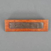 Messing plaquette met tekst 'Lutine 1758' in ovaal en daar links van driemaal het jaar 1799 afgeslagen, vermoedelijk ijken, mogelijk afkomstig van het schip de 'Lutine', die in 1799 verging voor de kust van Terschelling met een lading goud aan boord -bevestigingssporen, op houten basement-, 3 x 18 x 4,5 cm