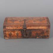 Dekseldoos met leder bekleed voorzien van reliëfdecor opgehoogd met goudkleurige details: het wapen 'George Rex' omgeven door ruiten, Engeland, vroeg 18e eeuw -ernstige houtwormschade, defecten, scharnieren manco-, 14 x 36 x 20 cm