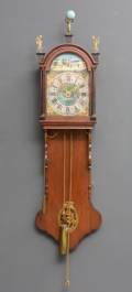 Friese staartklok in eiken kast, de beschilderde wijzerplaat met dorpsdecor en Romeinse cijfers, adres: Eelke Jans Tuininga, derde kwart 19e eeuw -recent gerestaureerd-, 150 x 38 x 23 cm