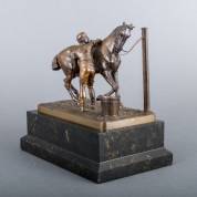 Carl Kauba (1865-1922), ruiter die zijn paard borstelt, brons, gesigneerd, staand op zwart marmeren basement, 26 x 25 x 25 cm