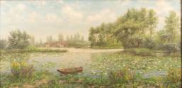 Huibert Antonie Ravenswaay (1891-1972), roeibootje op vijver met waterlelies, olieverf op doek, gesigneerd, 38 x 78 cm