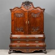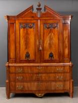 Mahonie timpaankabinet met gestoken ornament, tandlijst, twee deuren met gestoken houten ornamenten, schuingeplaatste zijstijlen met pilasters, drie lades in de onderkast, staande op gecanneleerde poten, Hollands, Louis Seize -reconstructies aan ornamenten-, 250 x 185 x 60 cm