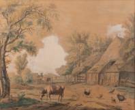 Hollandse School: gezicht op boerenerf met vee en figuren, aquarel en gouache, onduidelijk gesigneerd en gedateerd, 19e eeuw, 58 x 68 cm