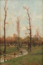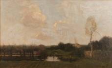 Théophile de Bock (1851-1904), boerin wandelend langs het water met knotwilgen, olieverf op doek, gesigneerd -gedoubleerd-, tentoongesteld geweest tijdens: 'Tentoonstelling van Nederlandsche beeldende kunsten' in het Stedelijk Museum Amsterdam, gehouden ten aanleiding van het Regeringsjubileum van Koningin Wilhelmina 1898-1923, 54 x 88 cm