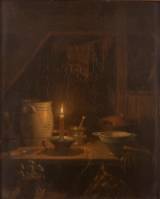 Omgeving Petrus van Schendel (1806-1870), interieur bij kaarslicht, olieverf op paneel, onduidelijk gemonogrammeerd, gedateerd 1853, 27,5 x 22,5 cm
