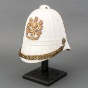 Witte tropenhelm met koperen Koninklijke Artillerie helmplaat en koperen met lederen kinketting, aan de binnenzijde bekleed met groene stof, model 1877, Brits, 1e bataljon 'The Princess of Wales's Own', Yorkshire Regiment -gebruikssporen-, staand op standaard, 24 x 30 x 21 cm