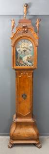 Amsterdams staand horloge in noten belijmde eiken kast, adres: Pieter Clock, circa 1750, de wijzerplaat met volledig kalender: datum, dagen van de week, maanden en maanstand, achtdaags uurwerk, slagewerk op twee bellen en speelwerk op de hele en de halve uren met tweemaal zes melodieën op speelrol, elf bellen en 22 hamers, de kap getooid door drie verguld houten beelden -beschildering van later datum, kast gerestaureerd of mogelijk van latere datum, defecten aan kap-, 286 x 76 x 41 cm
