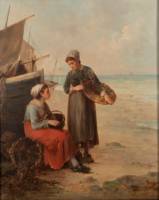 Europese School: twee vissersvrouwen op het strand, olieverf op doek, gesigneerd Vincent -gedoubleerd, werk past slecht in lijst-, 65 x 51,5 cm