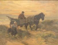 Willy Sluiter (1873-1949), schelpenvisser met dochter verlaat het strand bij ondergaande zon, olieverf op doek, gesigneerd -verpoetst en gedoubleerd-, 49 x 63 cm
