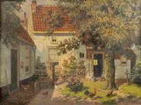 Jacob van Rossum (1881-1963), zonovergoten boerenerf met kippen, olieverf op doek, gesigneerd, 60 x 79 cm