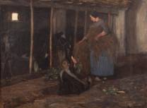 Willem de Zwart (1862-1931), stalinterieur met moeder en kind die een koe voeren, olieverf op doek, gesigneerd -gedoubleerd, craquelé-, 59 x 79 cm