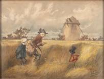 Mogelijk Elchanon Leonardus Verveer (1826-1900), soldaat en kind lopen door het graanveld, aquarel, gesigneerd, 29,5 x 39 cm