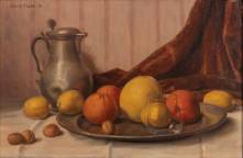 Willy Fleur (1888-1967), stilleven van tinnen schenkkan en schaal met vruchten en walnoten, olieverf op doek, gesigneerd en gedateerd '30, 39 x 59 cm