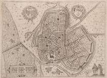 Gravure: plattegrond met opstanden van huizen en gebouwen van de oude Hanzestad Zutphen, met stadswapen het wapen van Gelderland, L. Guicciardini, 1613, 25 x 34 cm