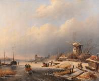 Hollandse School: wintergezicht met ijsvermaak en molen, olieverf op doek, gesigneerd J. Corver, 47 x 57 cm