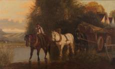 Mogelijk John Frederick Herring Jr. (1820-1907), houtkar met drie trekpaarden, olieverf op doek, gesigneerd -gedoubleerd-, 54 x 90 cm