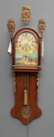 Friese staartklok in eiken kast, de wijzerplaat met polychroom decor van 'Veldslag bij Waterloo op den 18 junij 1815', slagwerk op dubbele bel, 19e eeuw -zonder mechaniek-, 148 x 42 x 23 cm