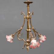 Messing drielichts plafondlamp met bladmotieven en kelkvormige glazen kapjes, begin 20e eeuw, 76 x Ø 70 cm