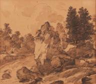 Omgeving Allaert van Everdingen (1621-1675), rots bij beek, inkttekening, niet gesigneerd, verso (collectie?)stempel 'Freund' in ovaal -scheurtje-, 17 x 19,5 cm