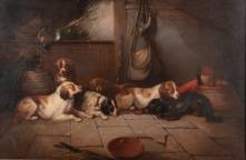 Hollandse School: roedel Drentse patrijshonden na de jacht, olieverf op doek -verdoekt-, 59 x 90 cm